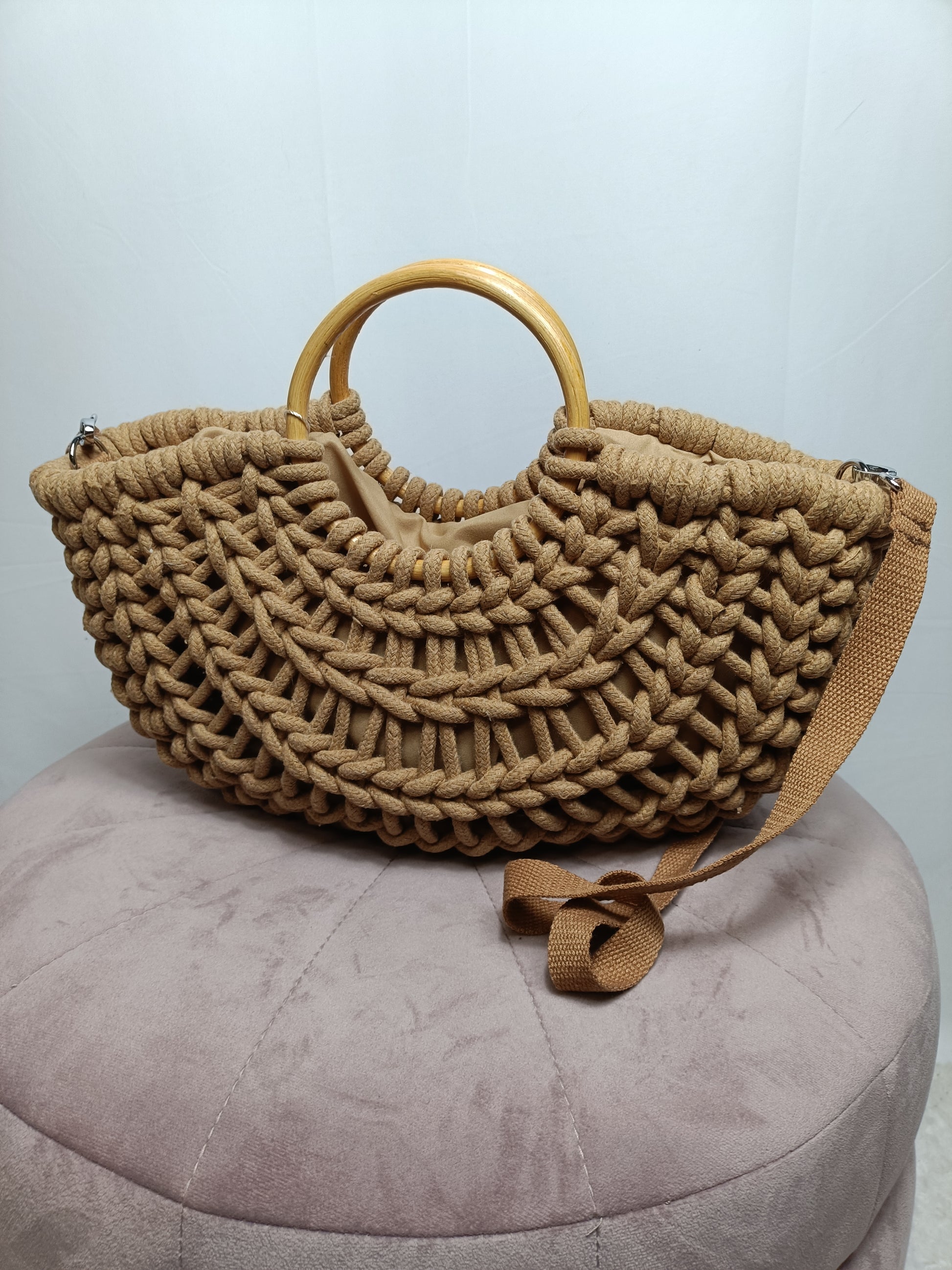 Bolso tejido a mano con diseño artesanal y detalle de asas en madera. Medidas ancho 40cm alto 30cm.