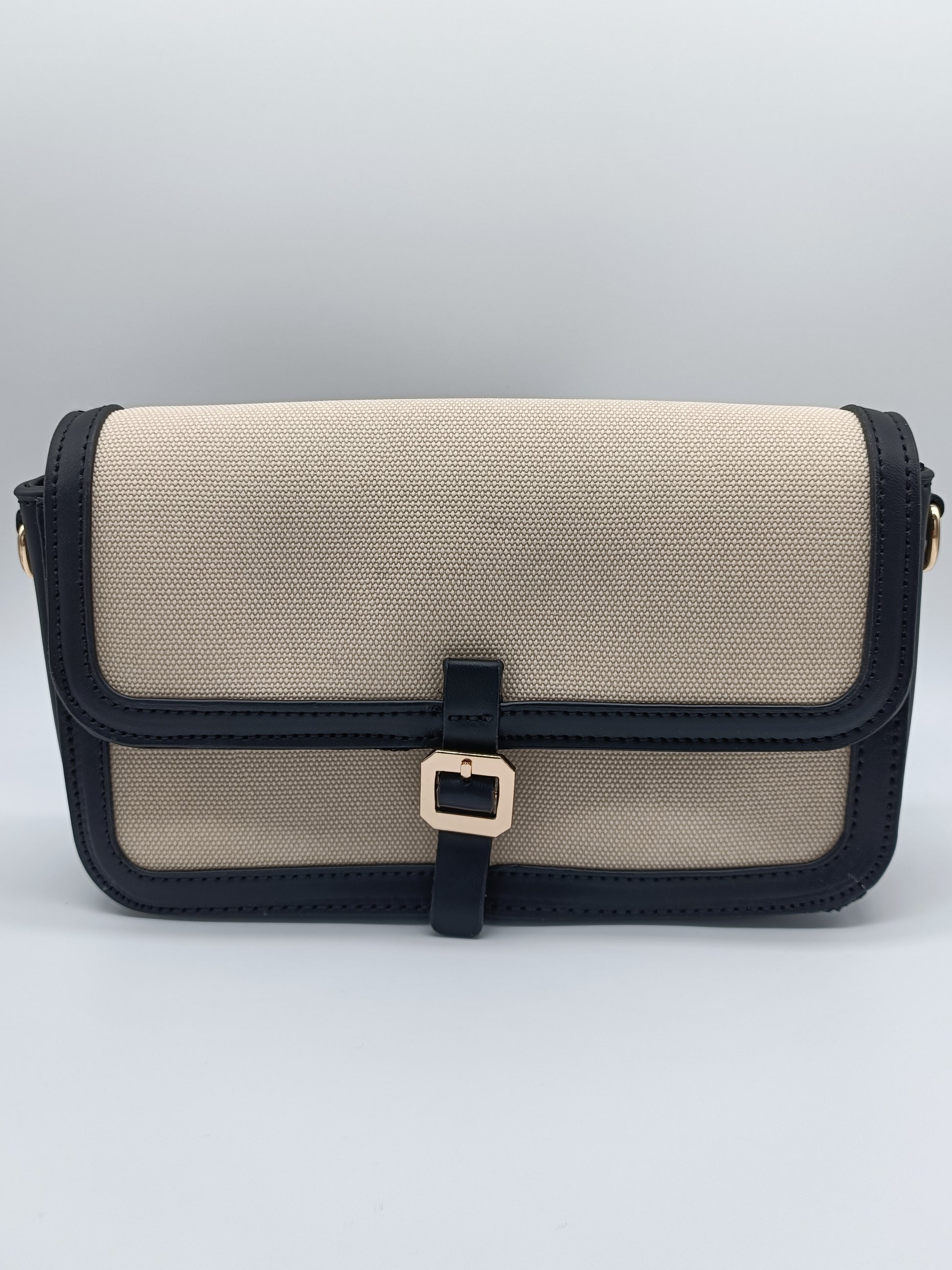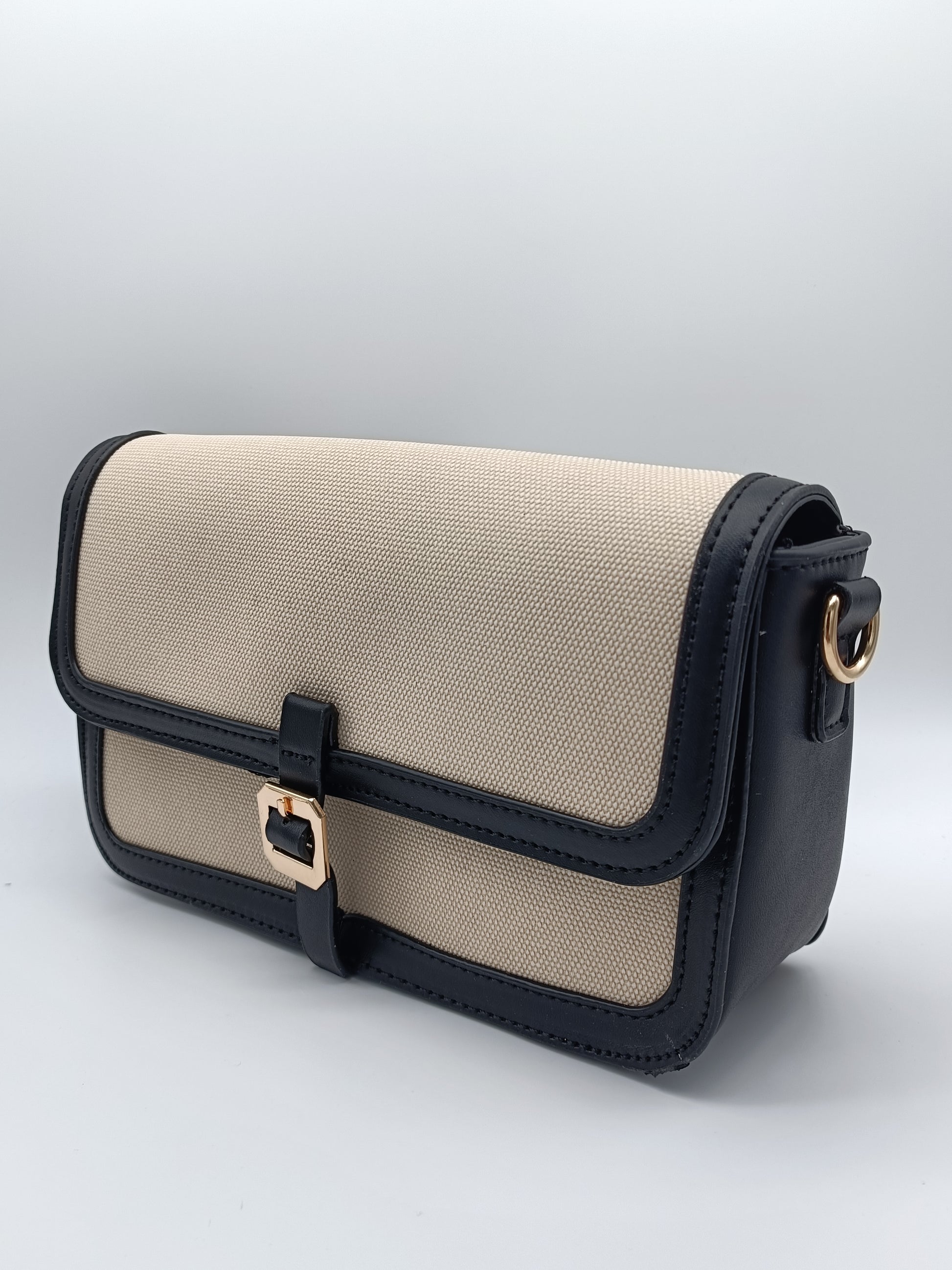 Bolso versátil combinado en tela y cuero sintético, con opción de llevar al hombro gracias a su correa con detalle de cadena y pañuelo estampado, o como bandolera con una correa mas larga y cómoda. Cuenta con un cierre magnético decorado con una hebilla dorada, perfecto para complementar sus outfits con un aire moderno. Medidas ancho 22cm, alto 15cm.