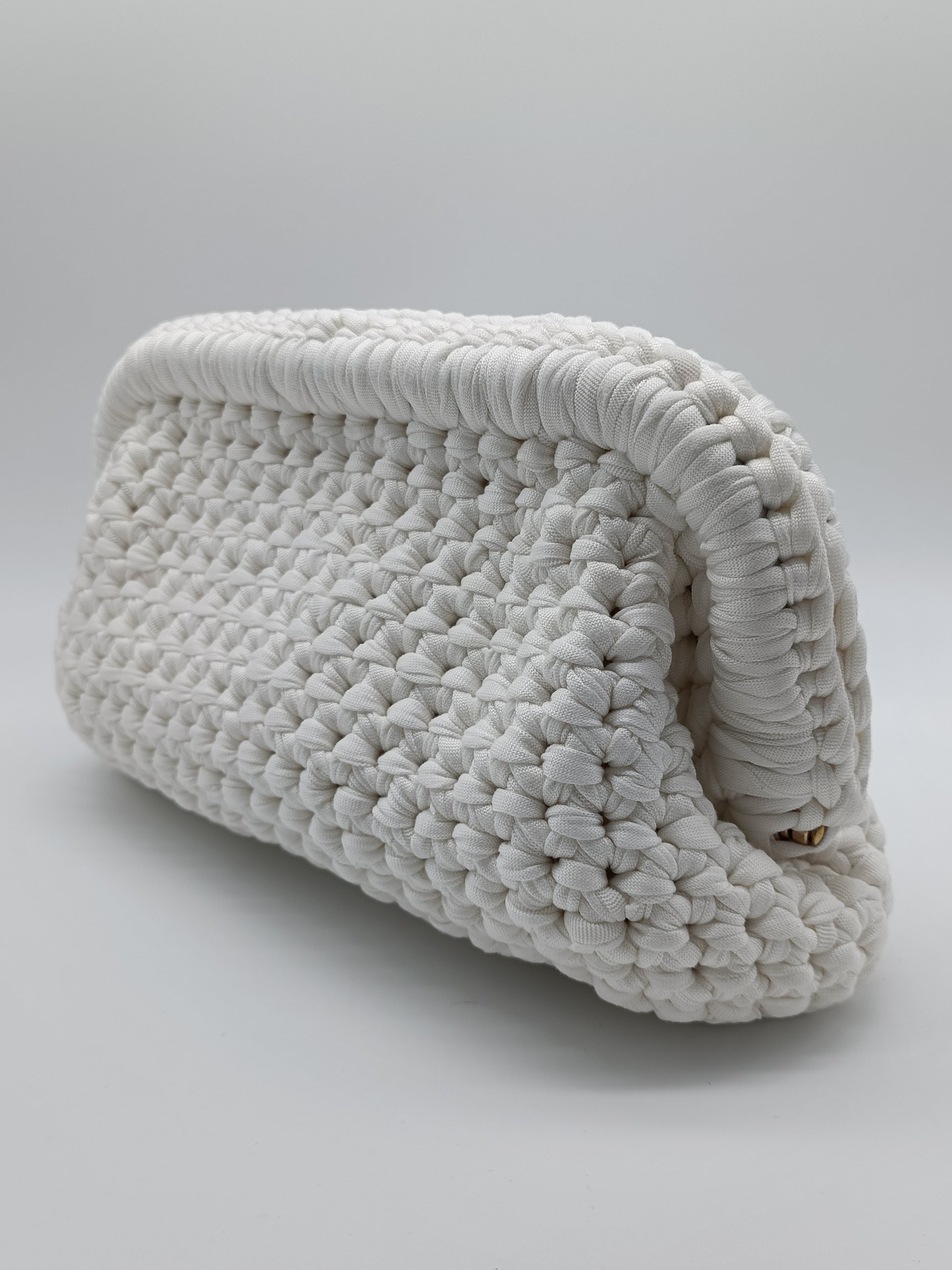Clutch tejido a mano en tonos beige nude o blanco, con textura gruesa y suave al tacto. Su diseño tipo sobre con cierre de boquilla rígida le da un aire moderno y artesanal, ideal para eventos o salidas casuales donde quieras destacar con un accesorio único. Medidas ancho 24cm, alto 17cm.