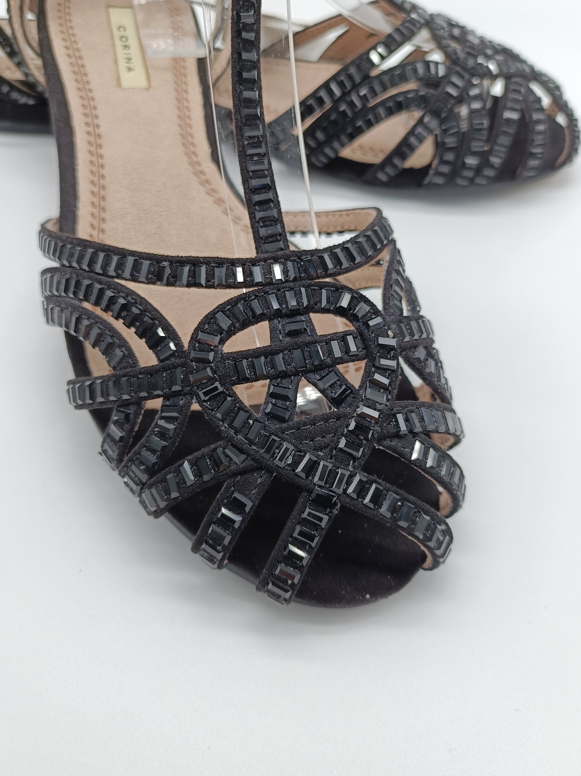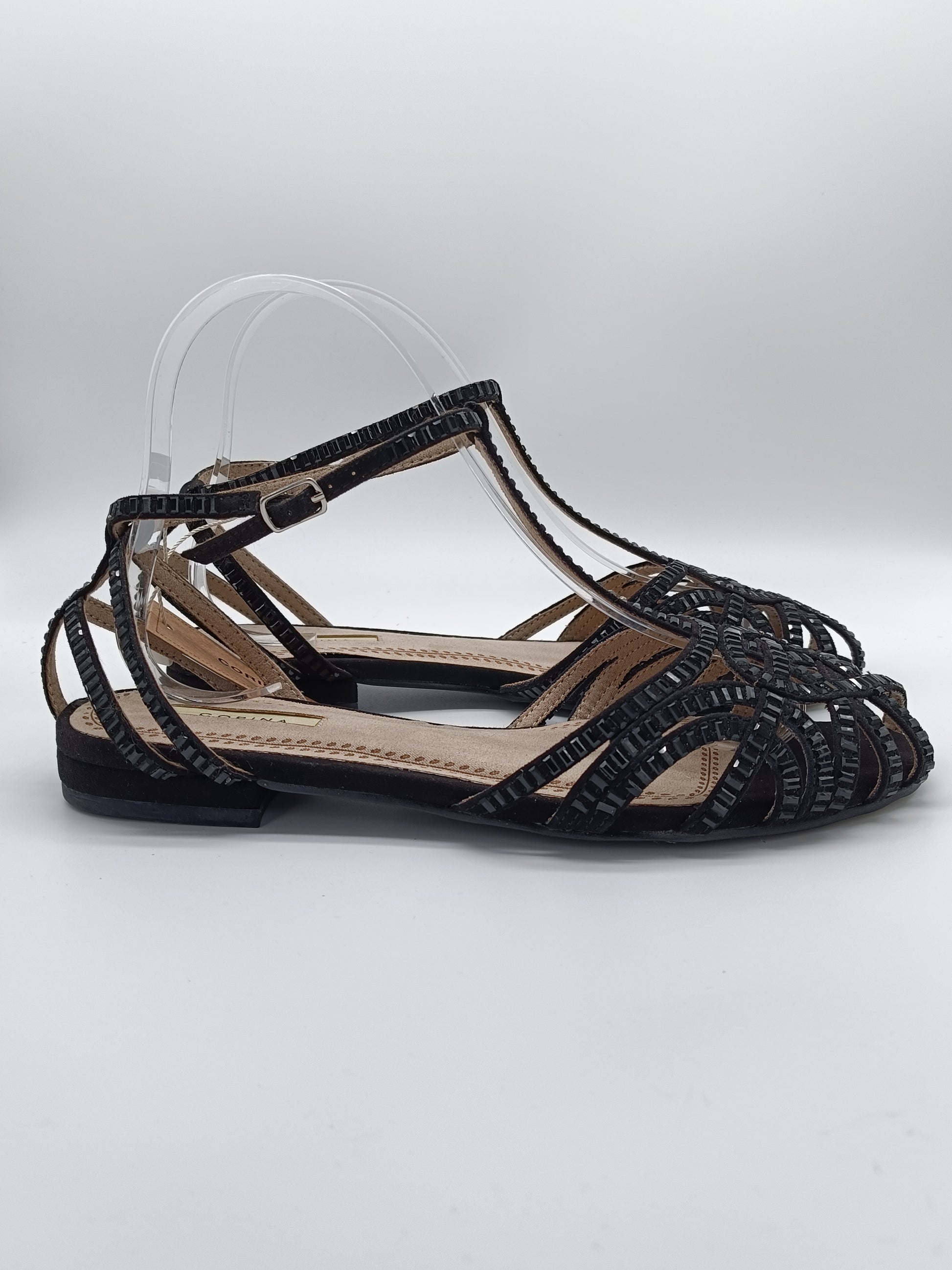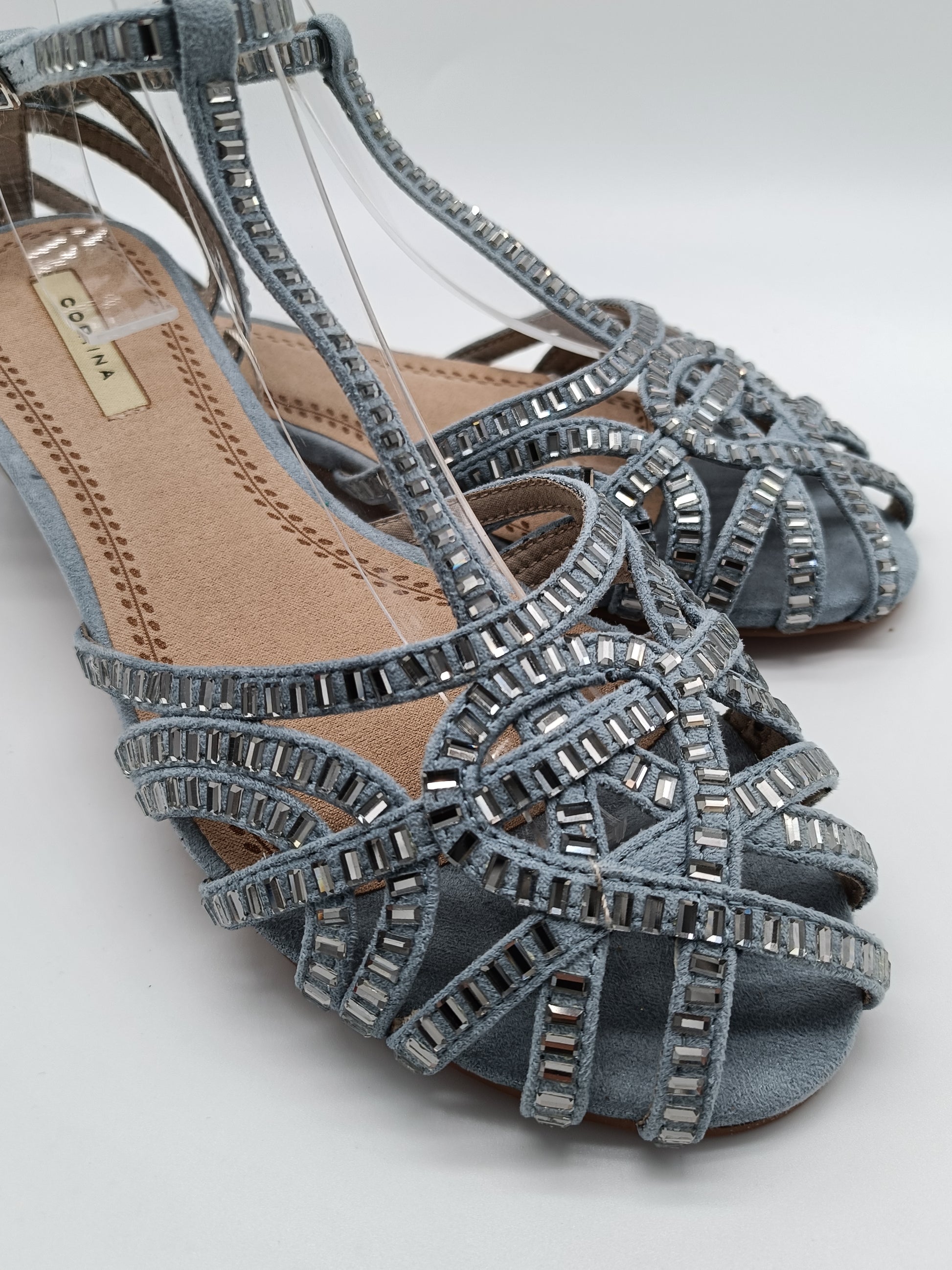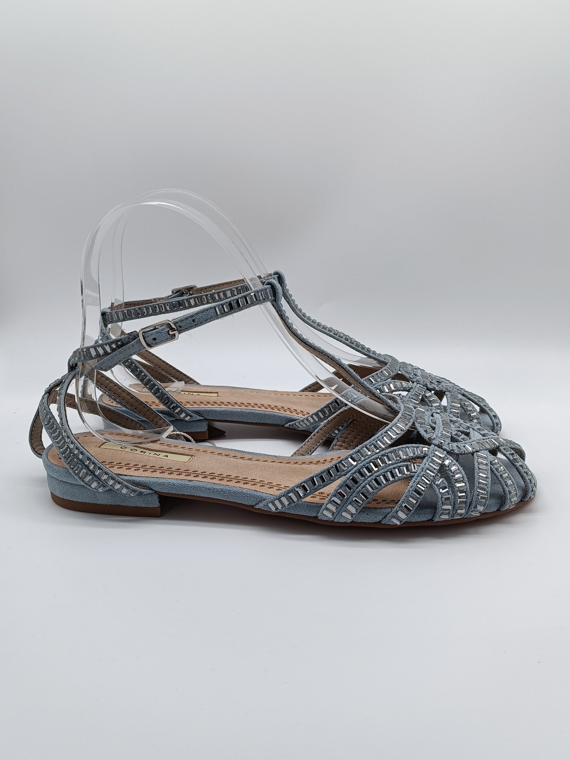 Sandalias planas con diseño trenzado con tiras finas decoradas con strass y cierre de pulsera con hebilla ajustable. Elegancia y comodidad en cada paso.