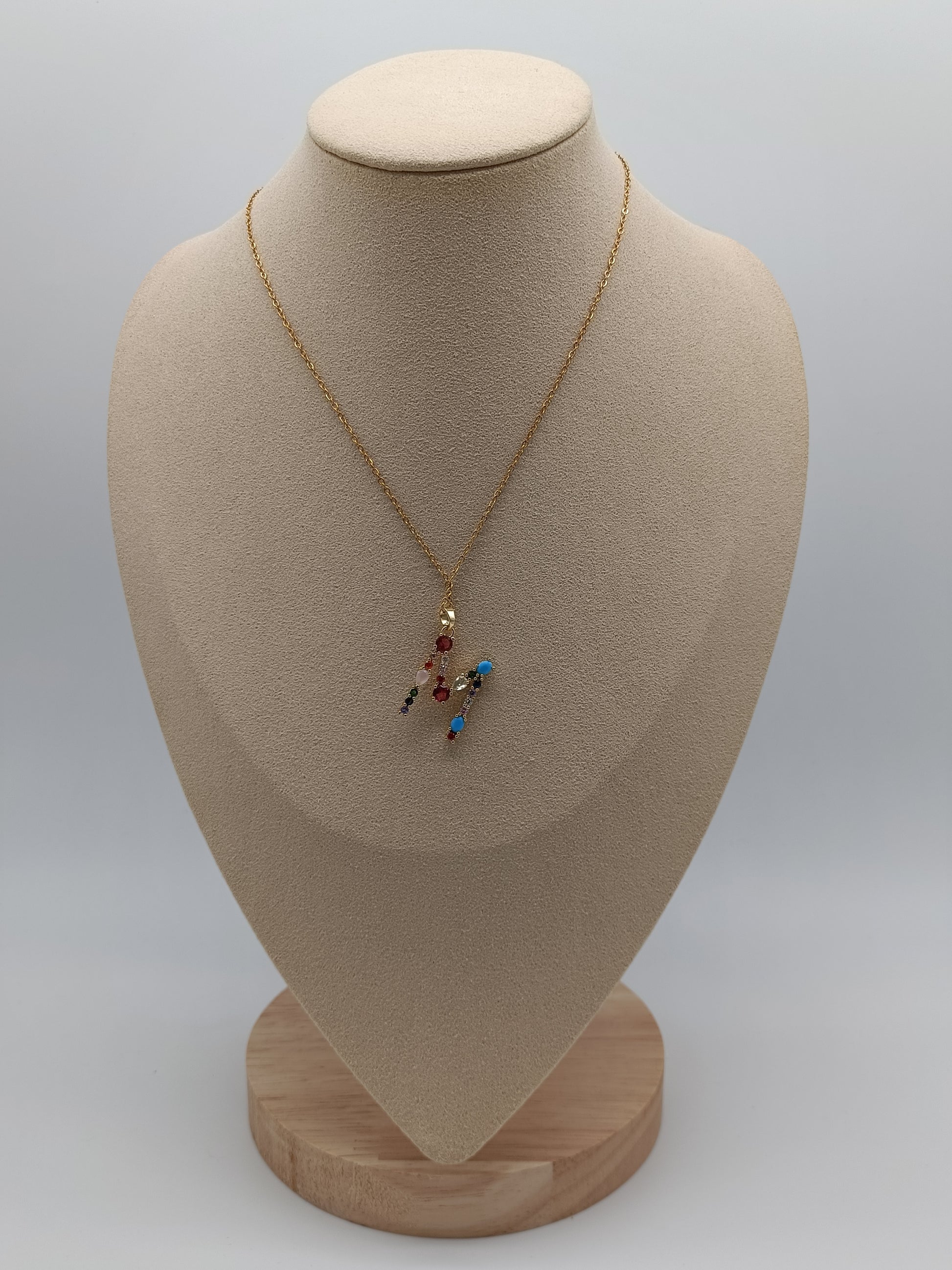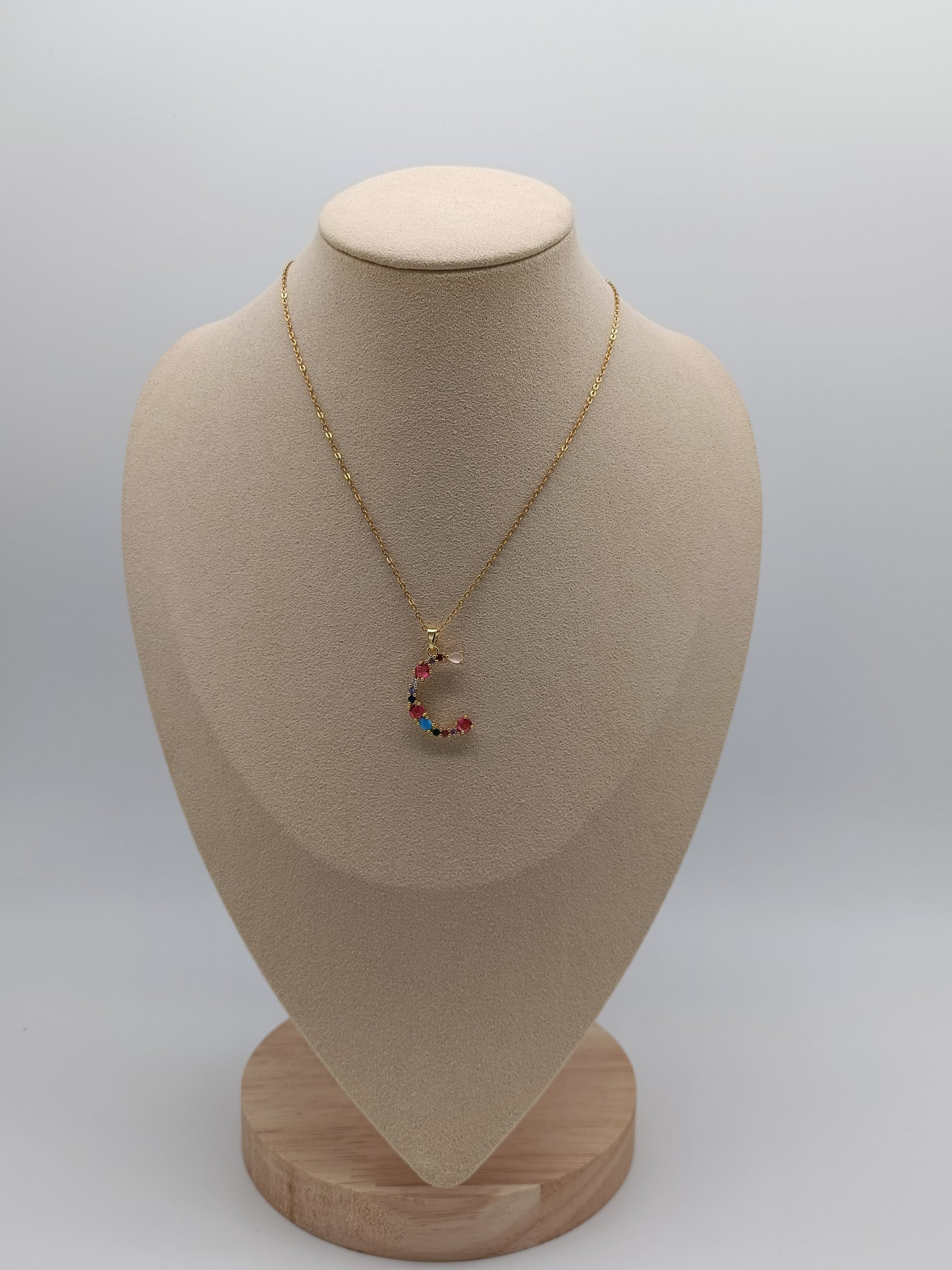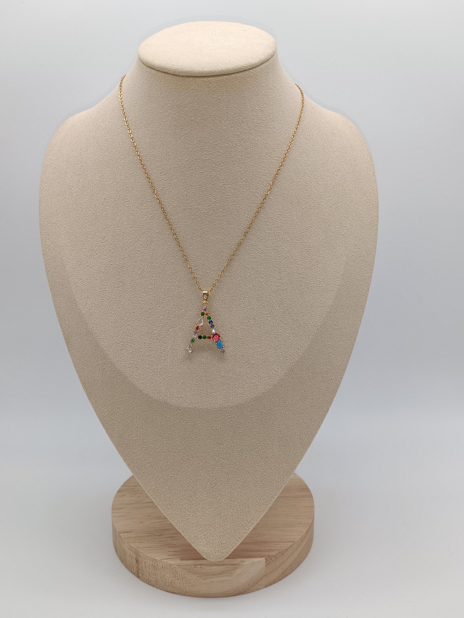 Collar con cadena dorada de acero y dije de inicial decorado con piedras de colores. Personaliza tu estilo con este accesorio brillante y único, ideal para destacar con un toque especial.