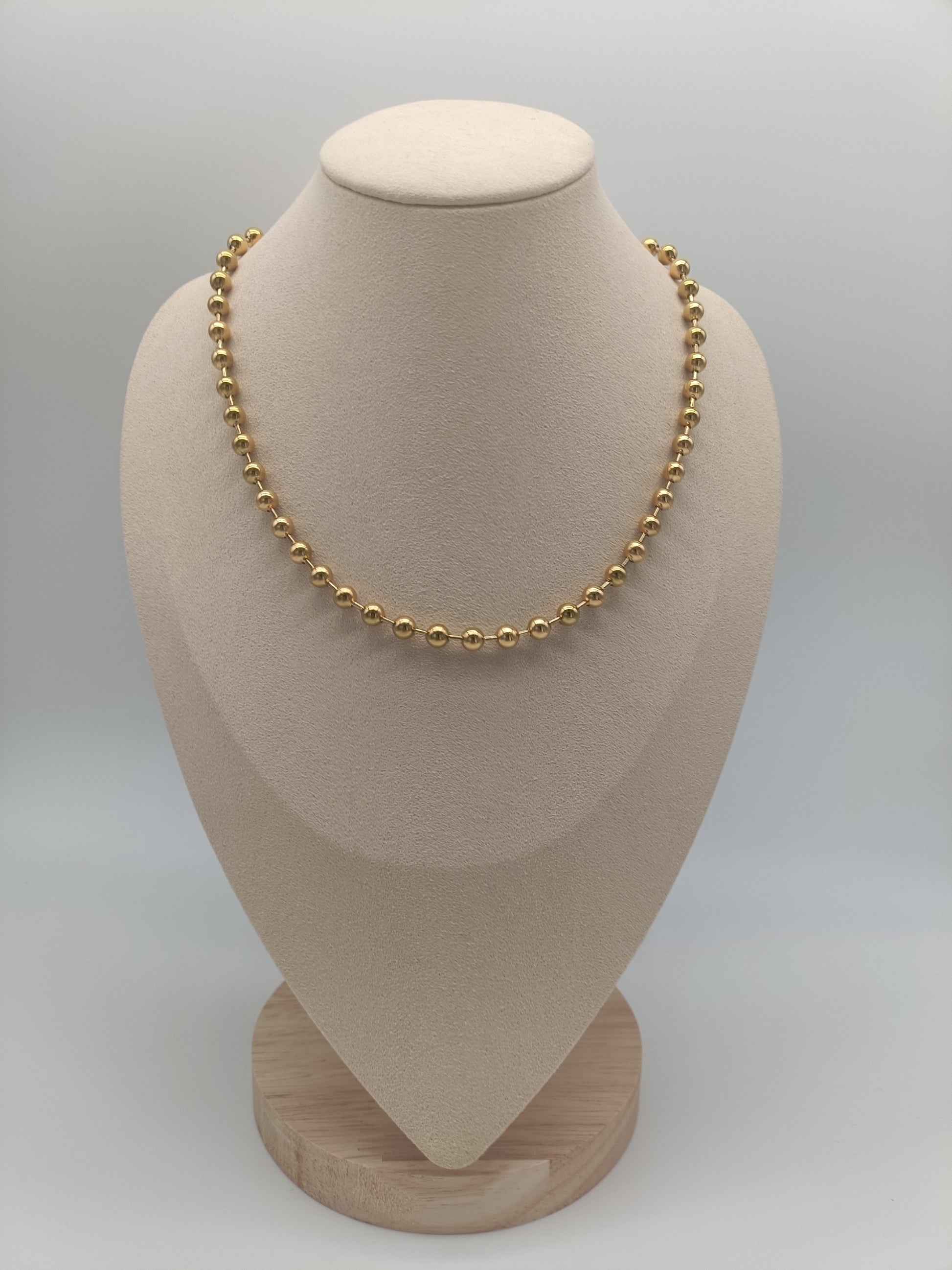 Un elegante collar de bolas doradas o platas. Ideal para añadir un toque sofisticado y moderno a cualquier atuendo, destacando por su simplicidad y elegancia.