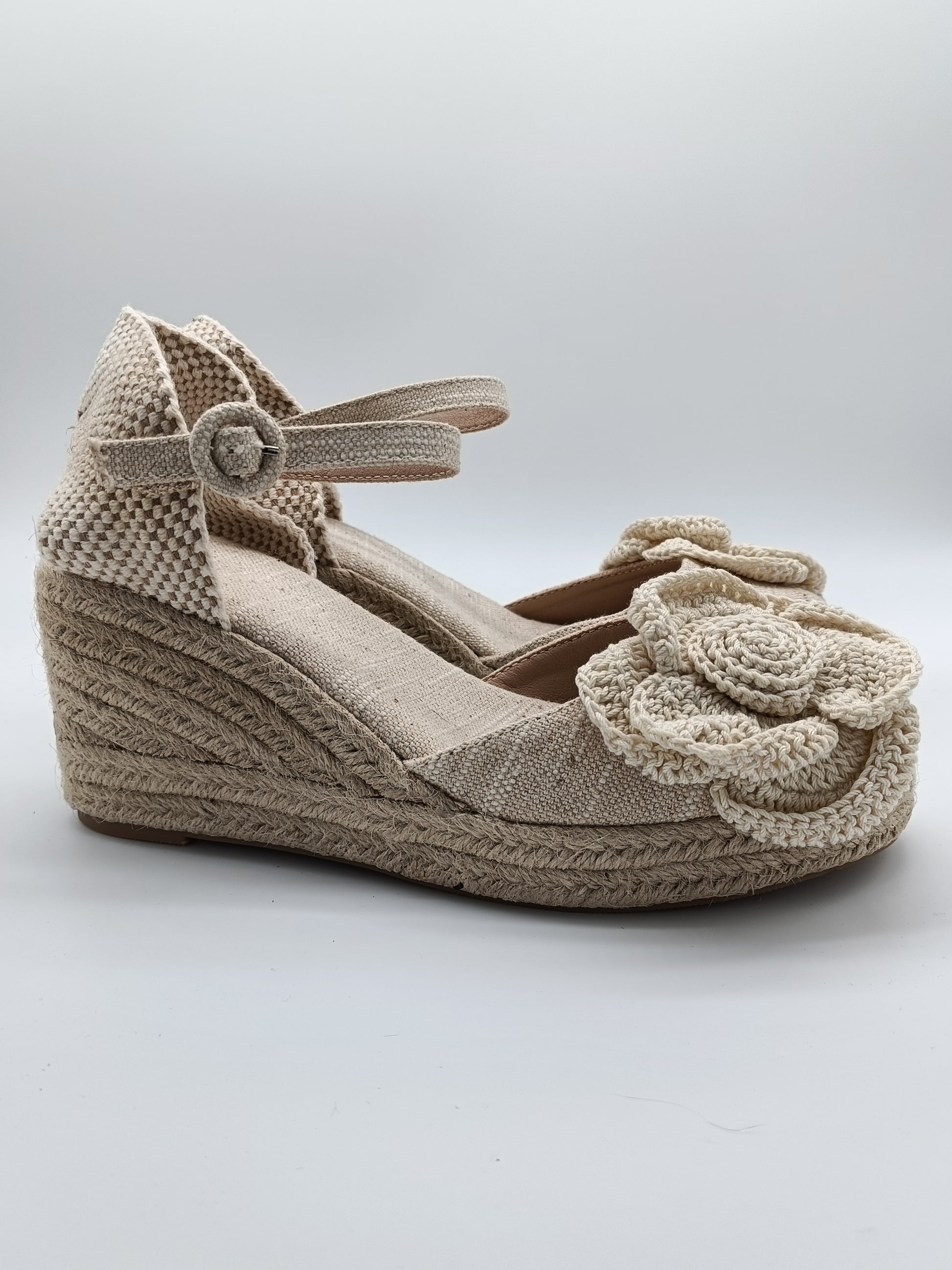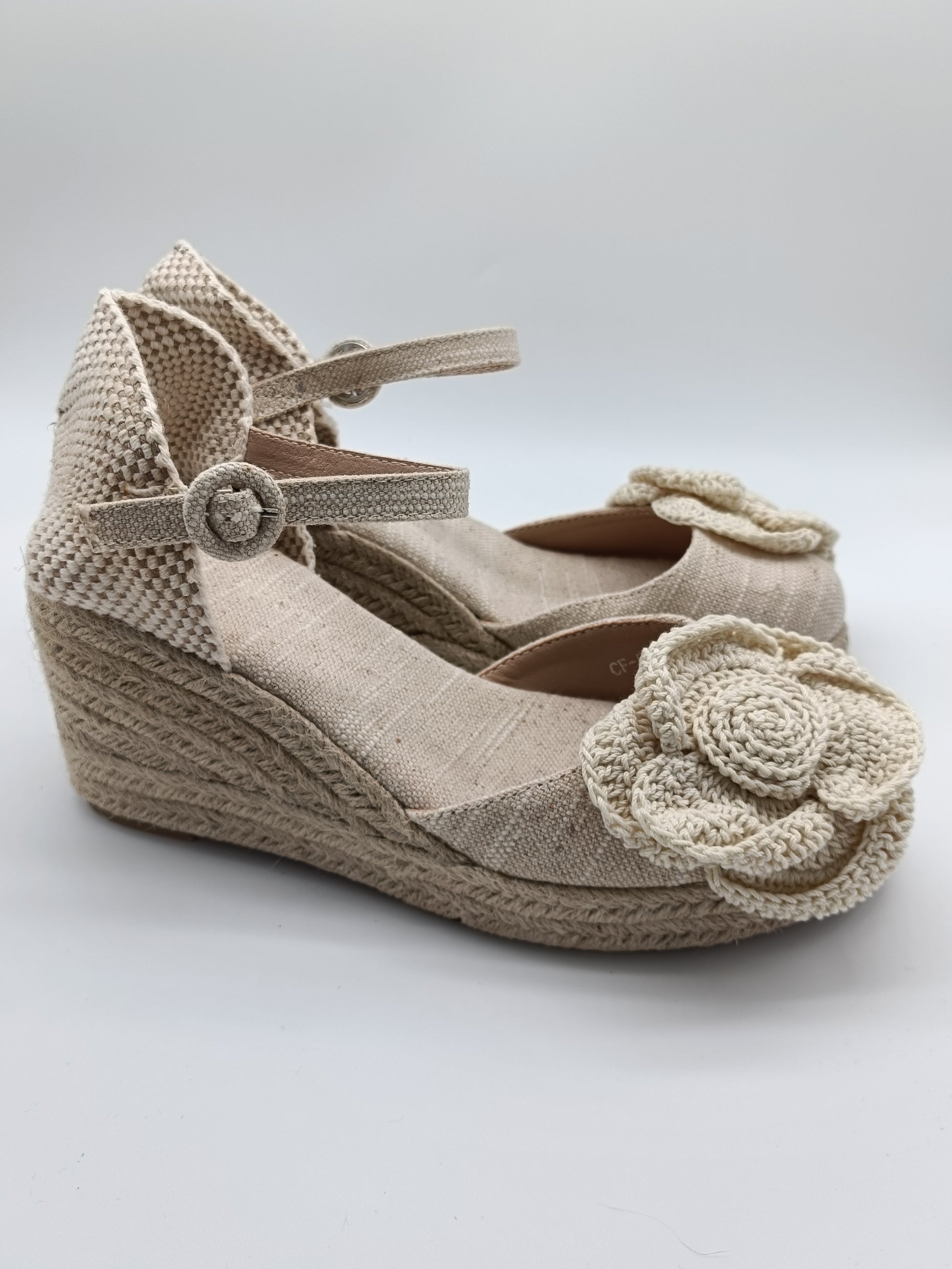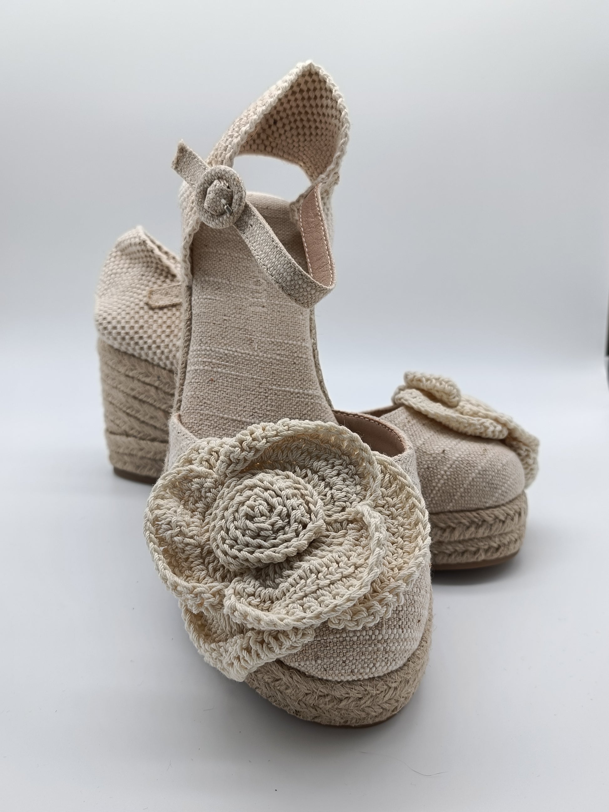 Dale un toque fresco y natural a tu look con estas cuñas de yute hechas a mano. Confeccionadas en tonos beige neutros, combinan una base de yute trenzado de 7cm con tejido de lino y detalles artesanales. Su distintivo adorno en forma de flor tejida a crochet aporta un aire bohemio y femenino, perfectas para primavera y verano,