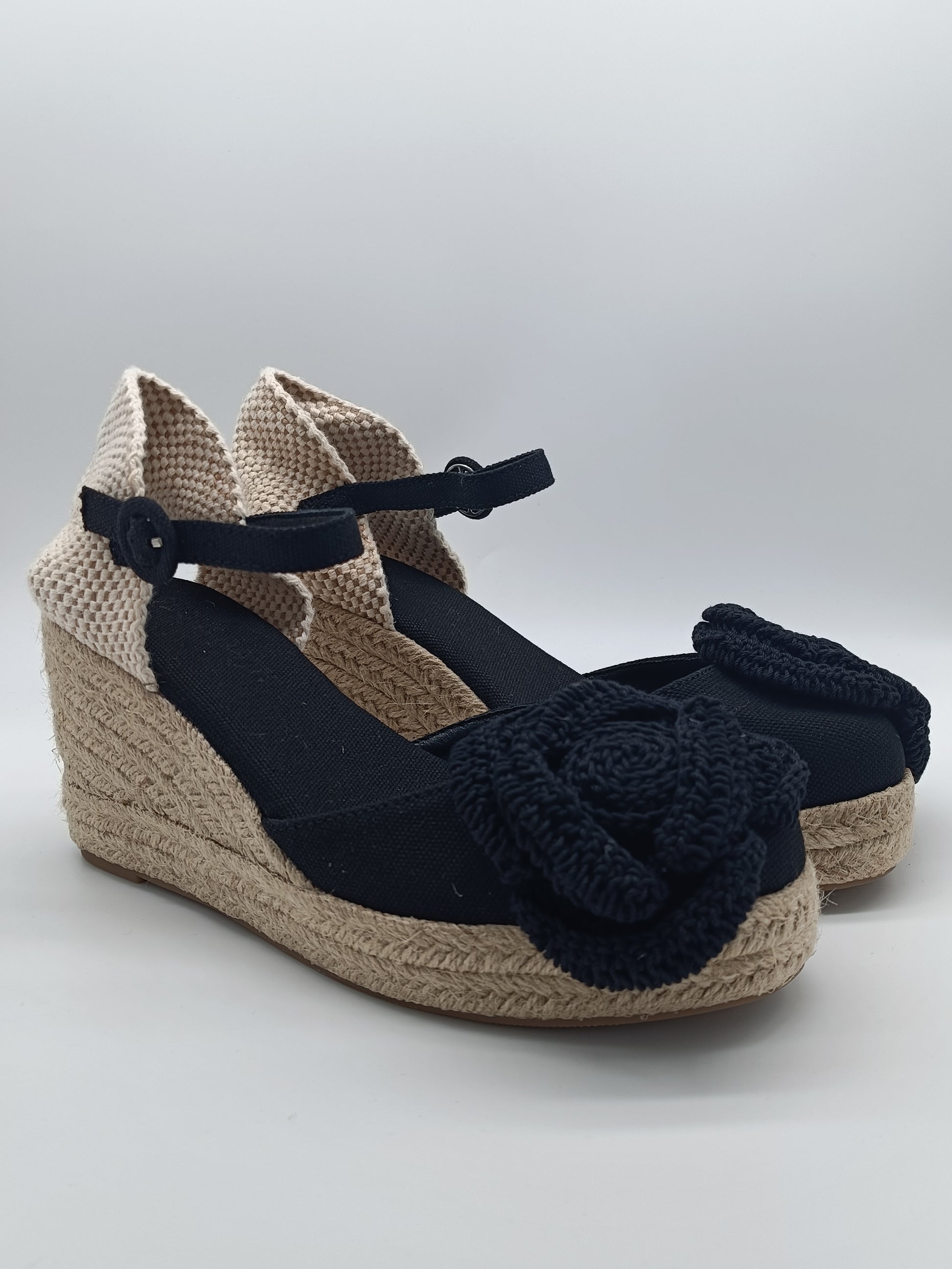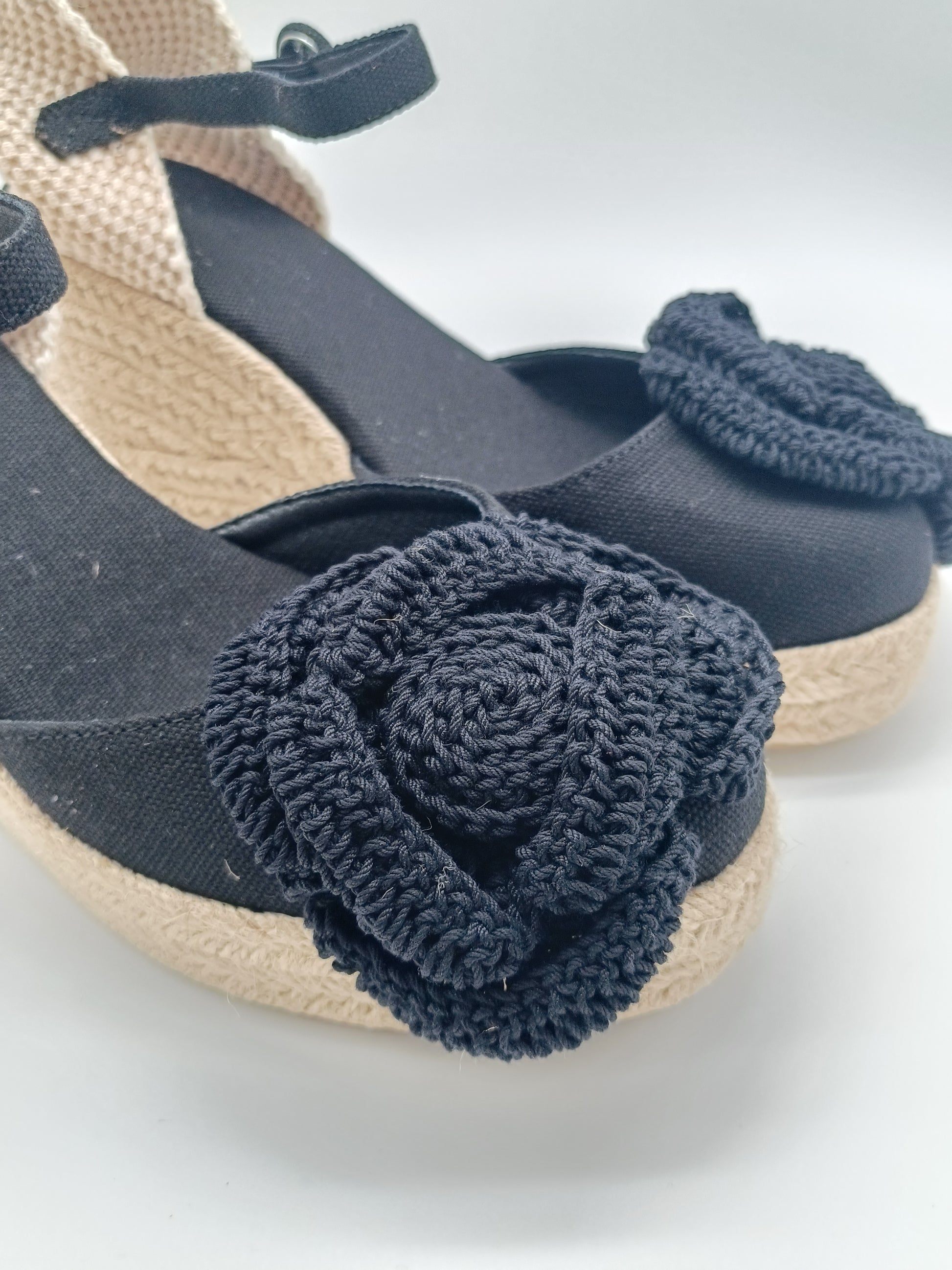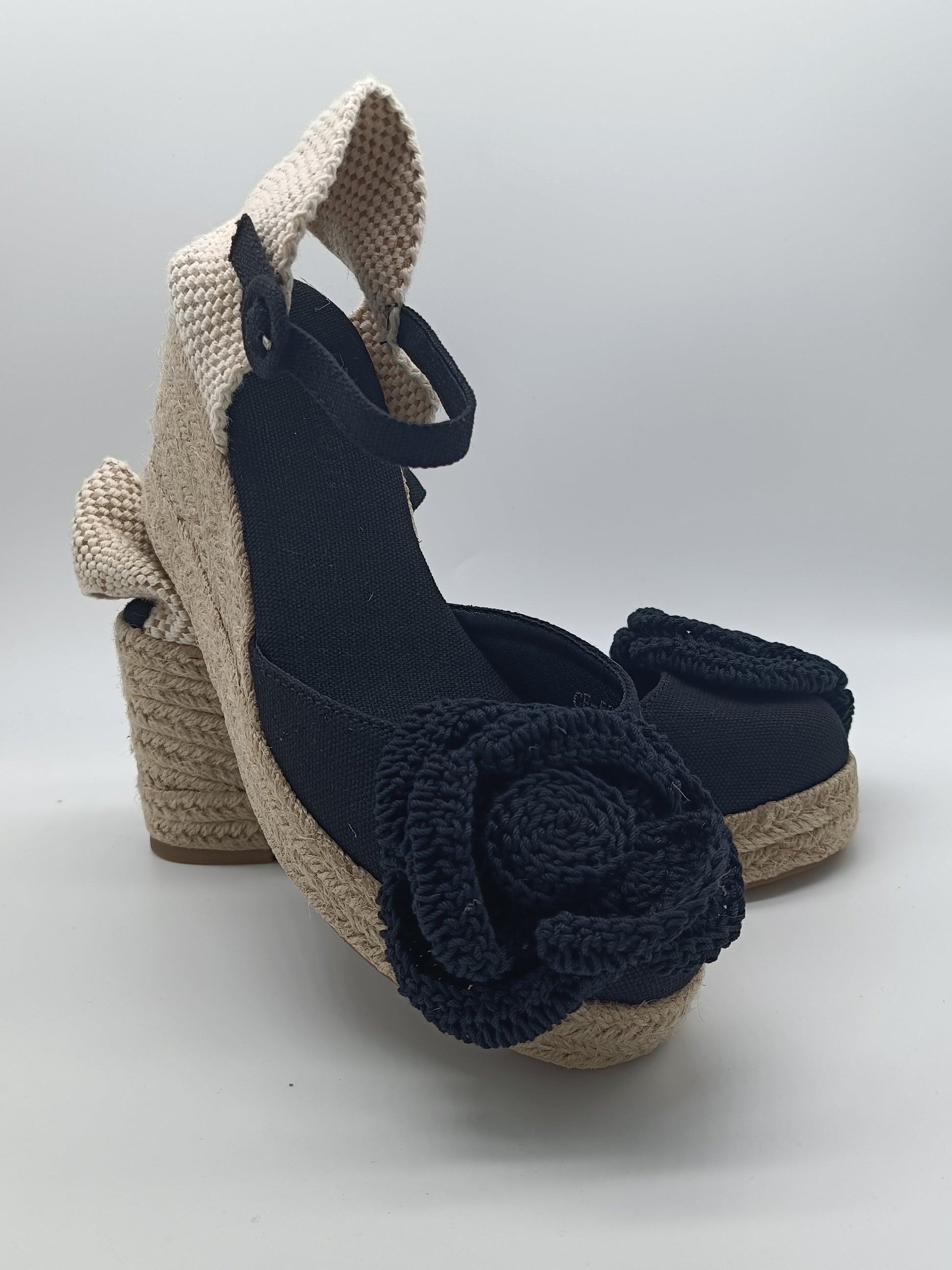 Dale un toque fresco y natural a tu look con estas cuñas de yute hechas a mano. Confeccionadas en tonos beige neutros, combinan una base de yute trenzado de 7cm con tejido de lino y detalles artesanales. Su distintivo adorno en forma de flor tejida a crochet aporta un aire bohemio y femenino, perfectas para primavera y verano,