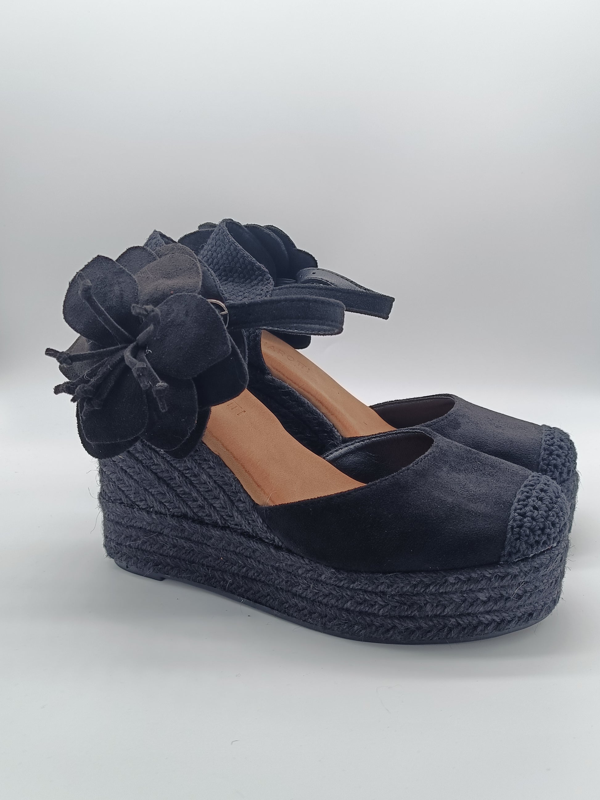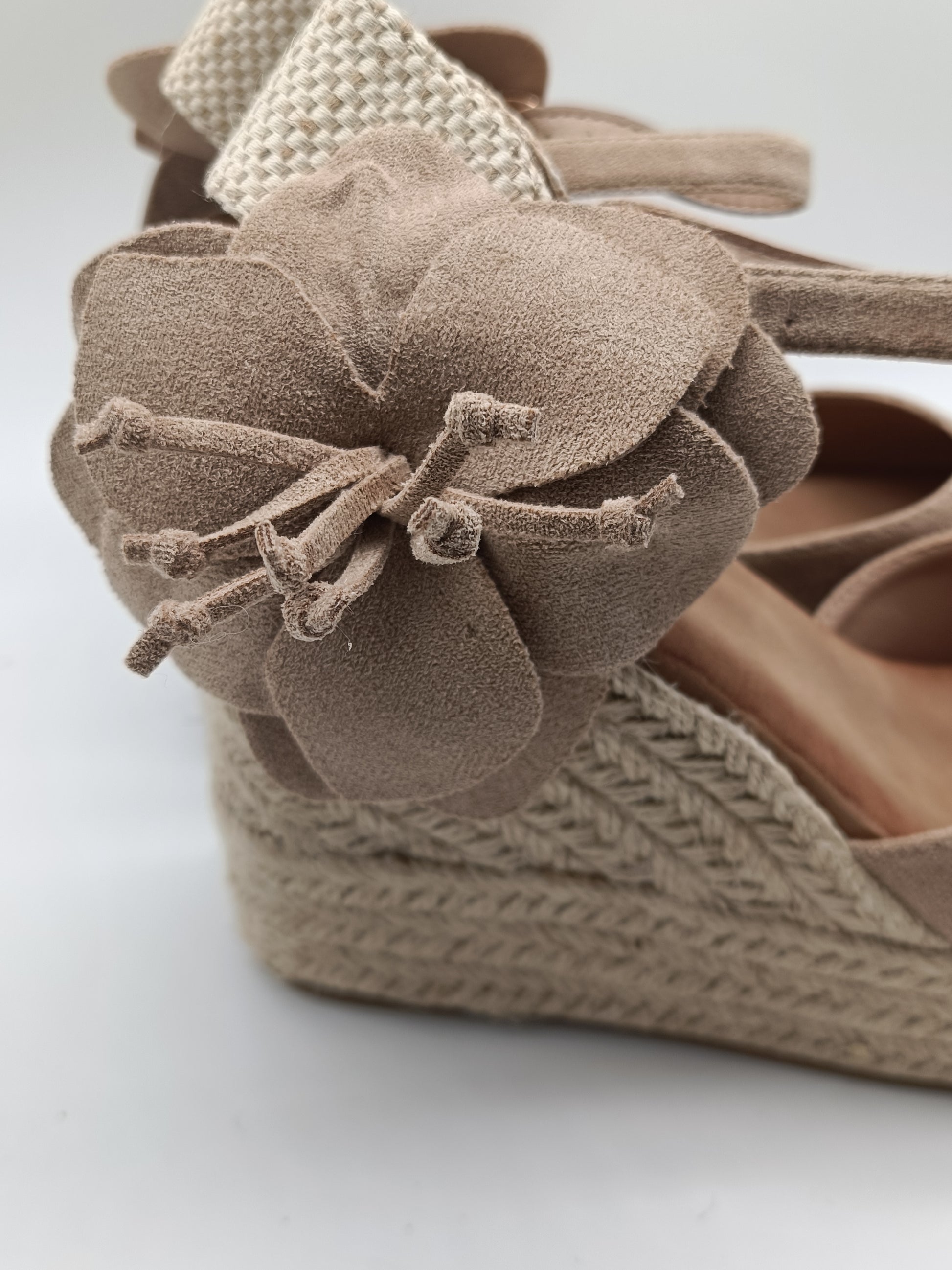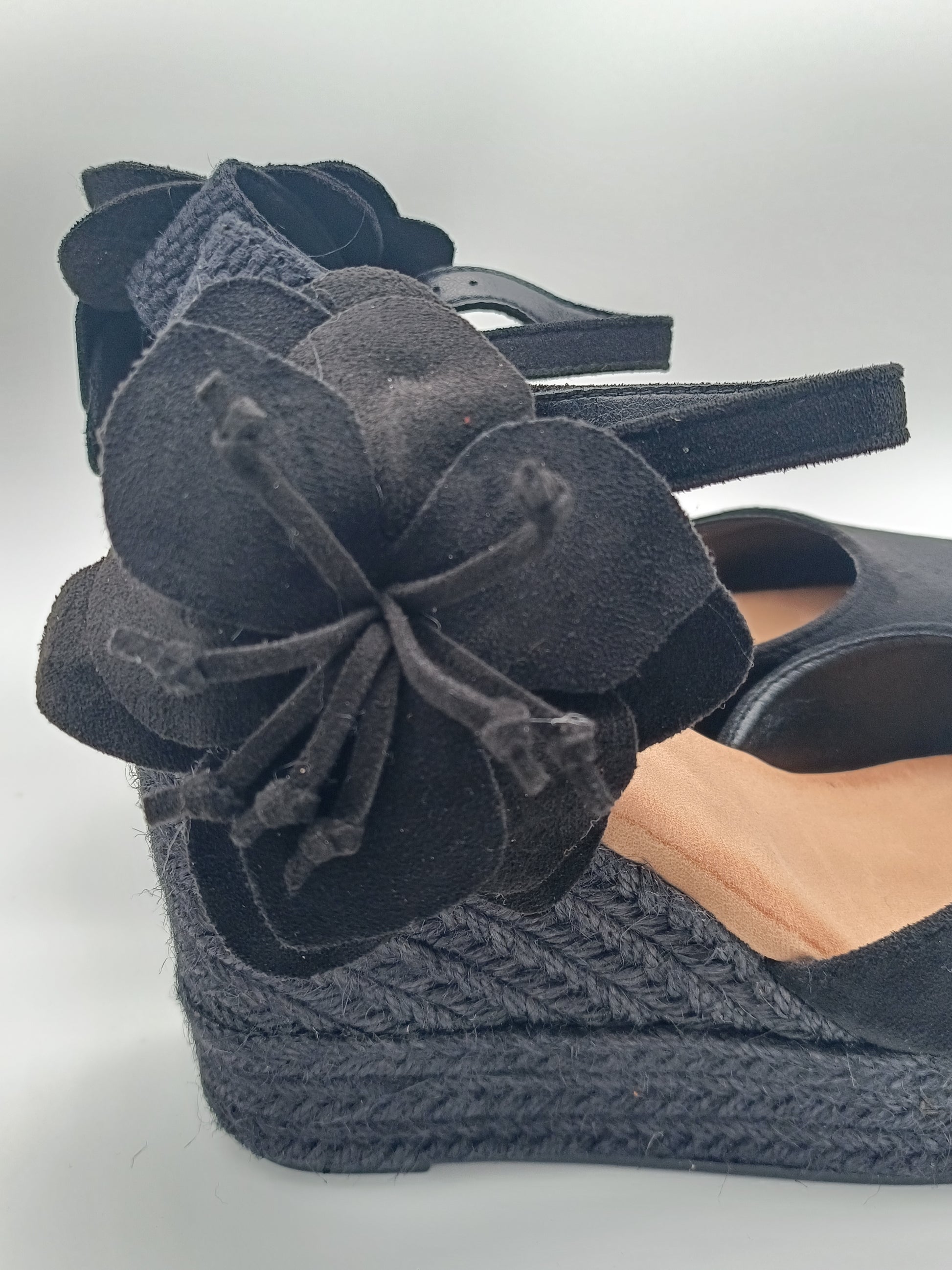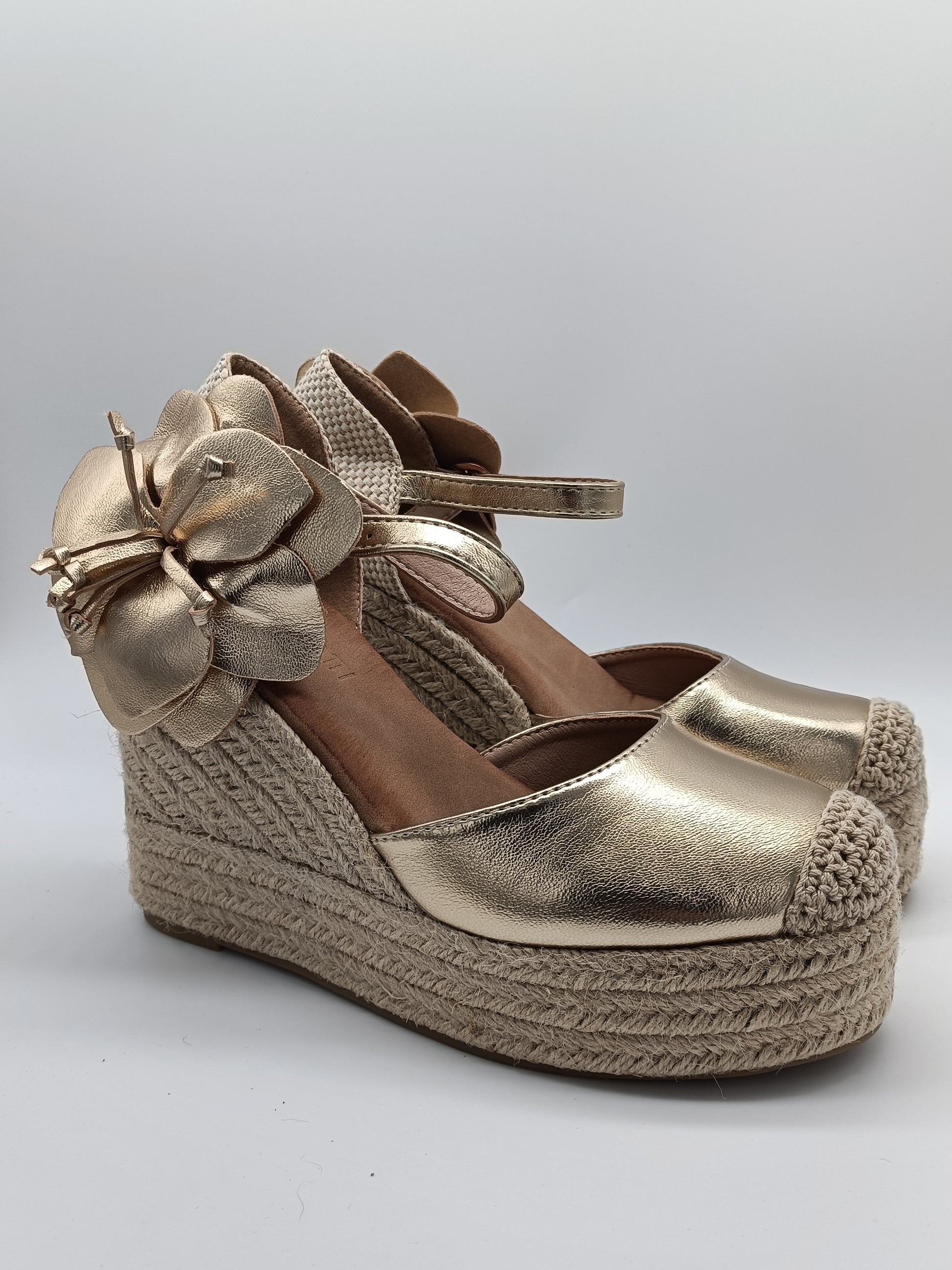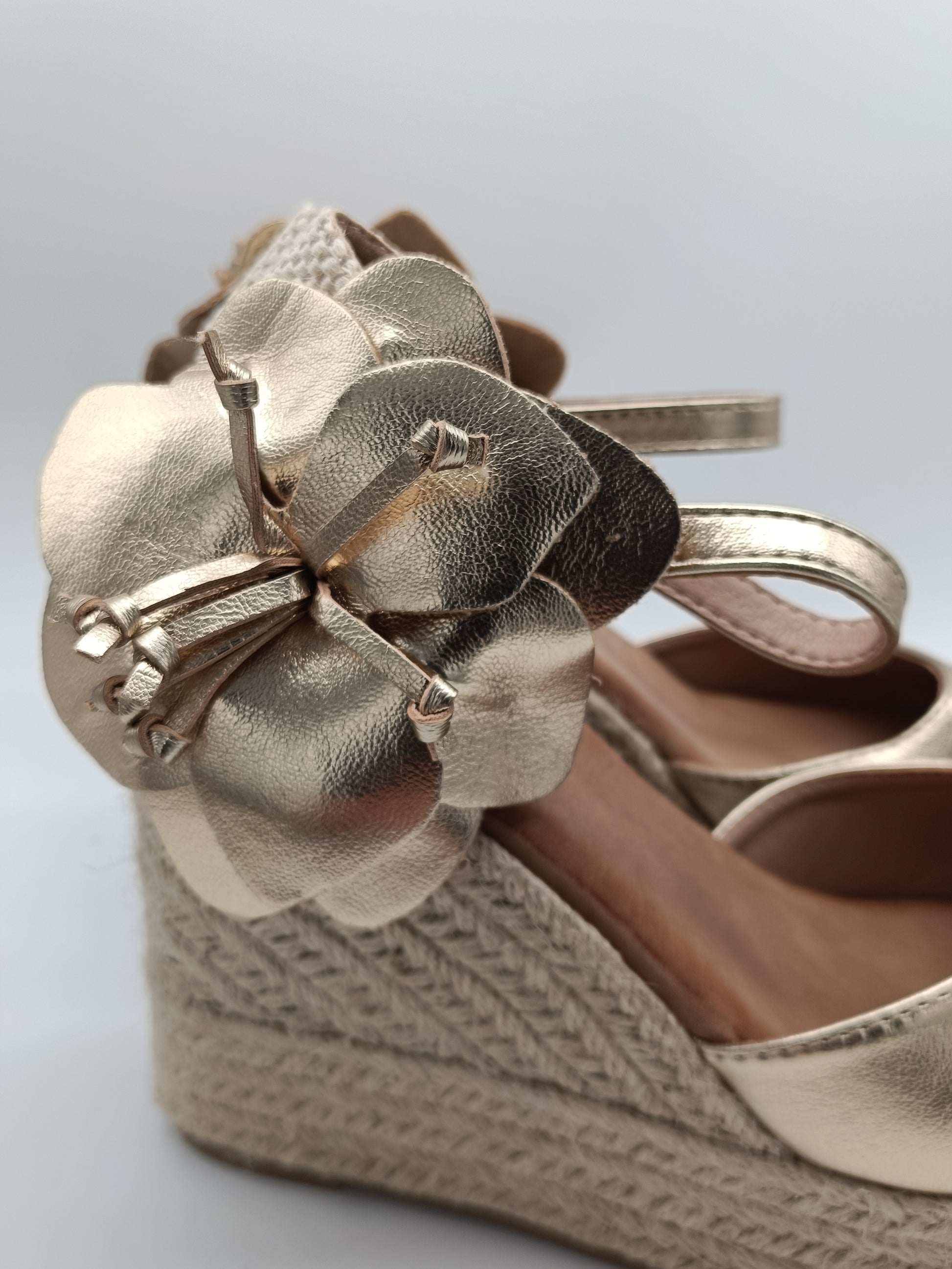 Cuña con plataforma de yute de 10cm de altura. Diseño con pulsera ajustable al tobillo y detalle floral en el lateral que aporta un toque único y femenino.