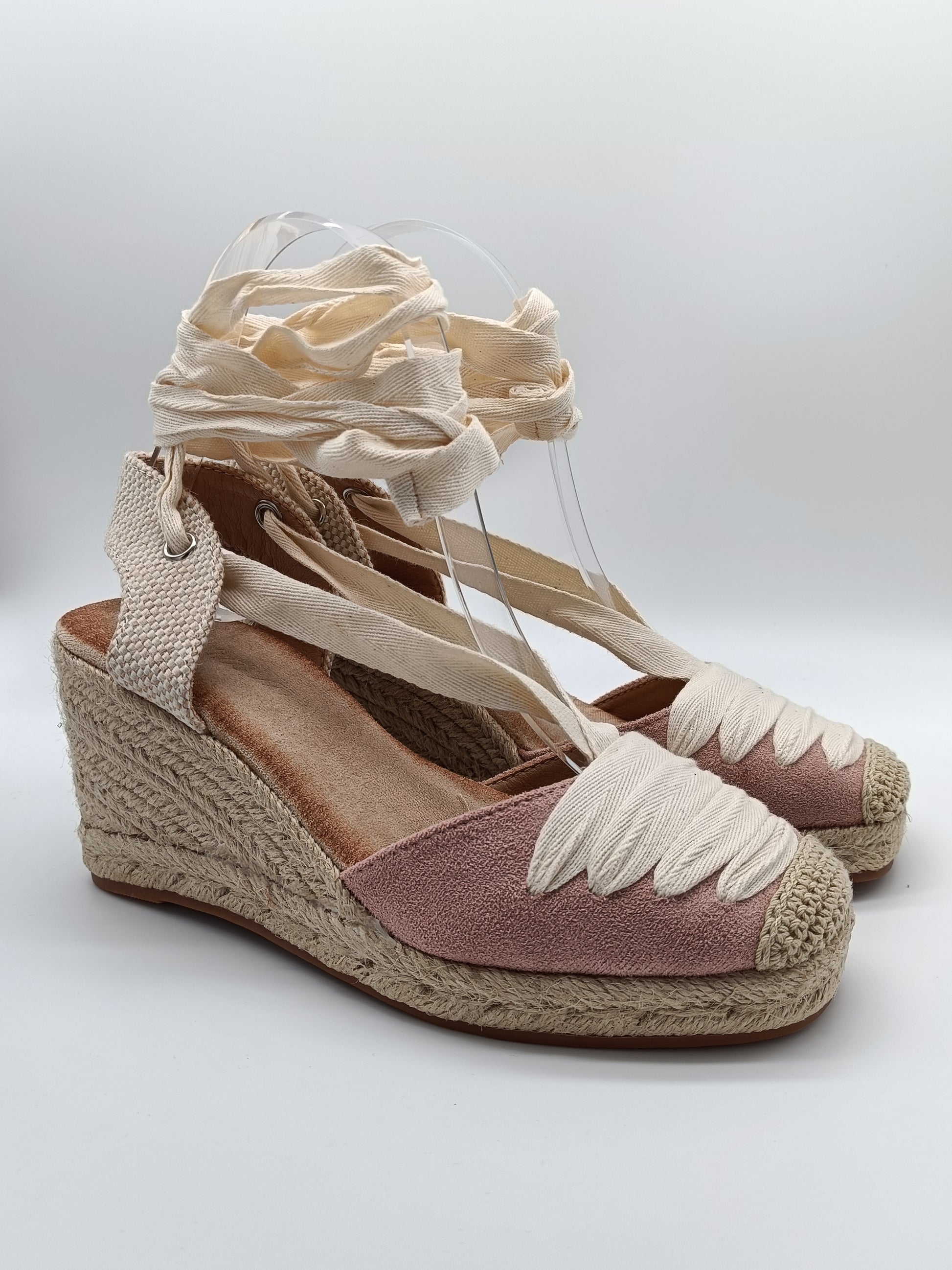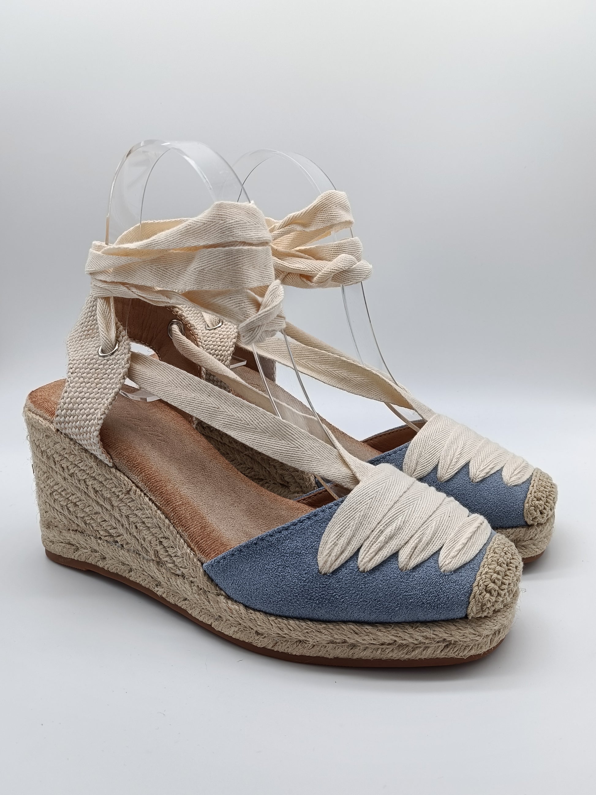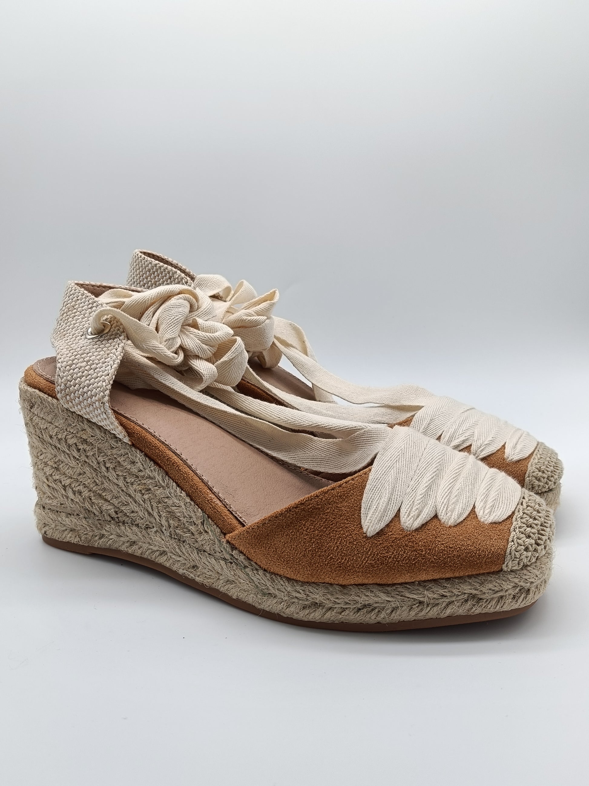 Eleva tu estilo con estas cuñas de yute, un clásico renovado que combina lo mejor de la tradición y la moda actual. Su diseño con puntera cerrada y detalle entrelazado en lona aporta un toque artesanal y sofisticado. La plataforma de esparto de 7cm ofrece altura y comodidad, ideal para acompañarte durante todo el día. Las cintas para anudar al tobillo no solo garantiza un ajuste perfecto, si no que suma un aire romántico y femenino que transforma cualquier look. Se recomienda pedir una talla más de la que usa normalmente.
