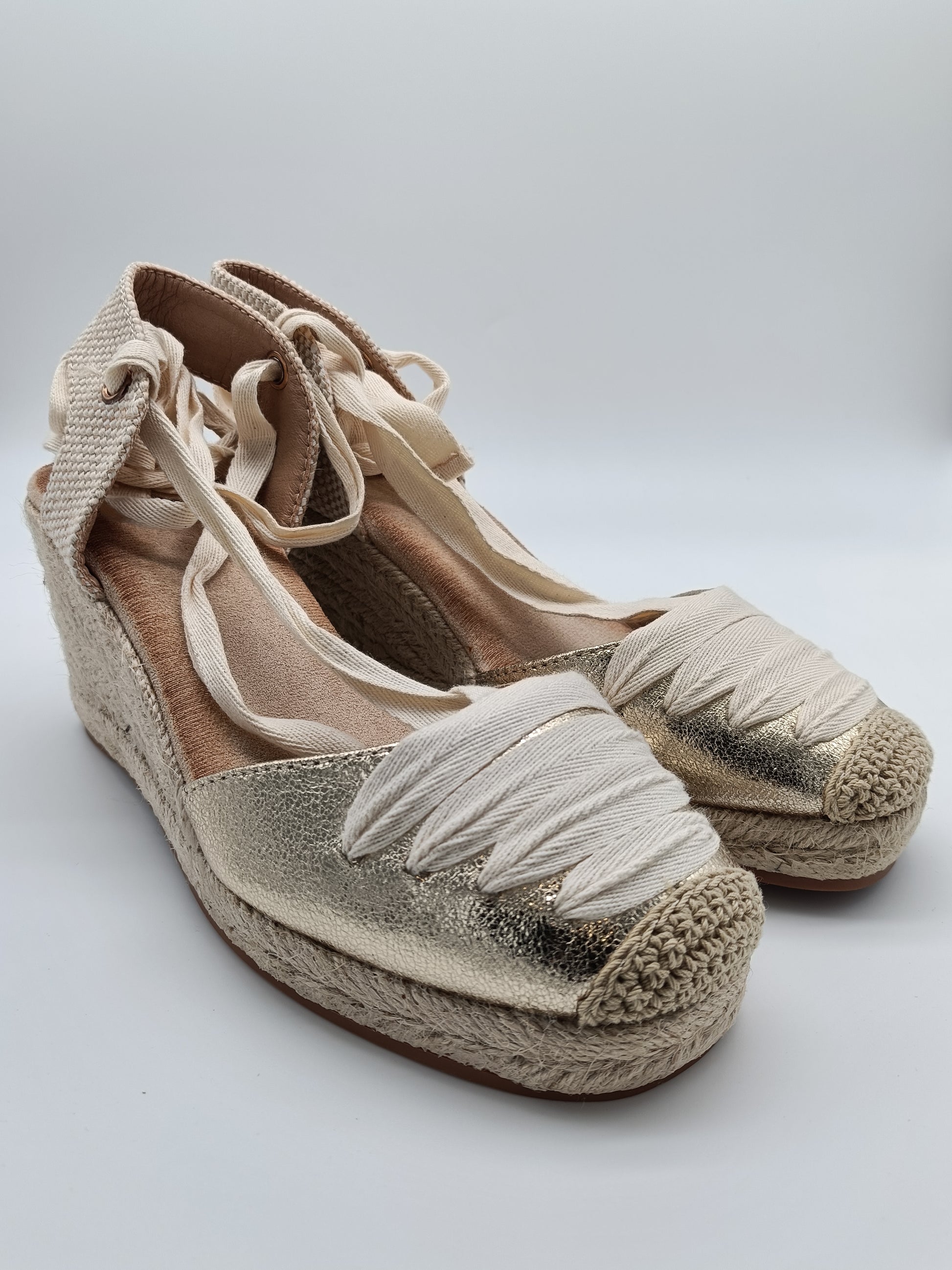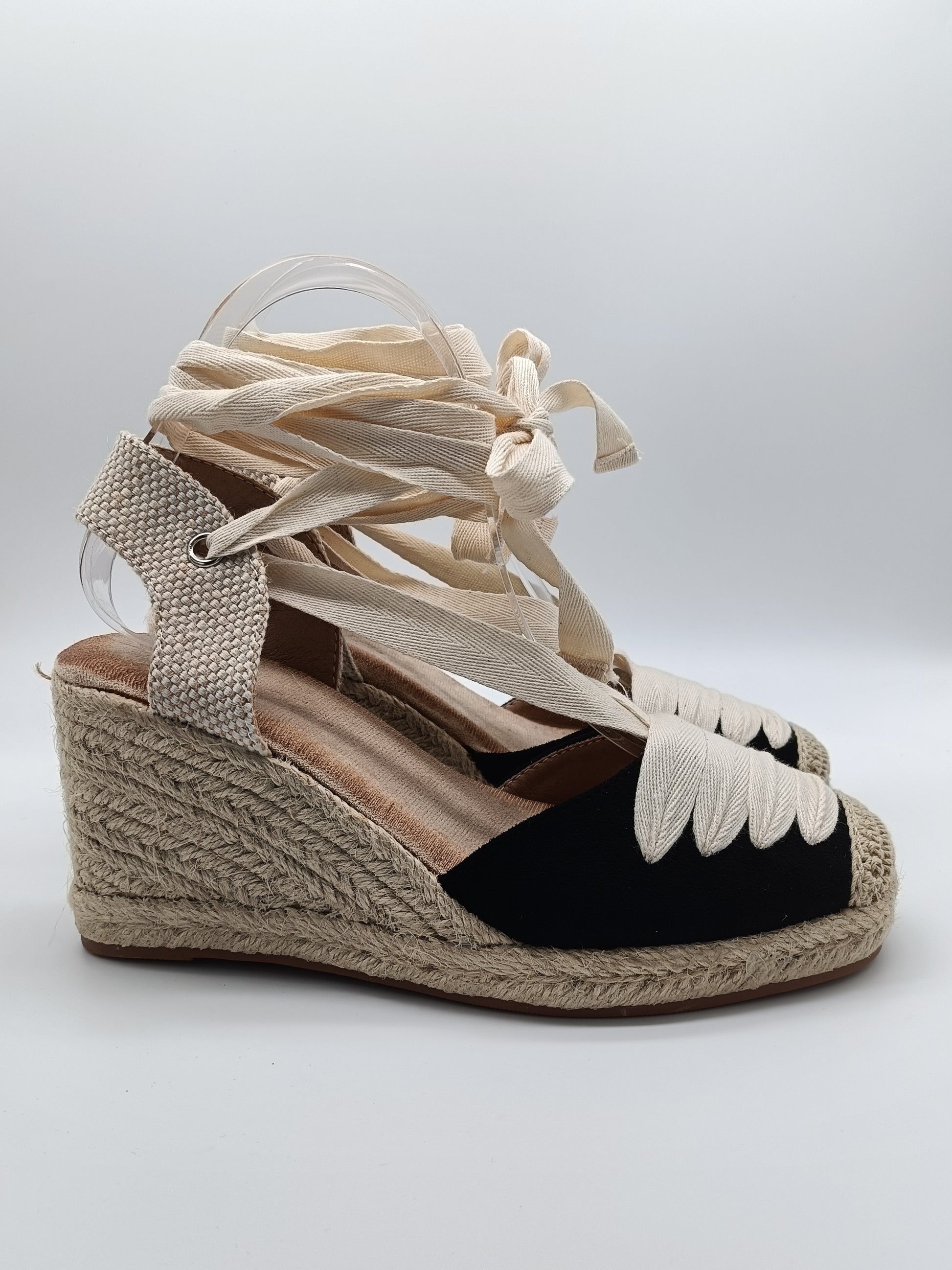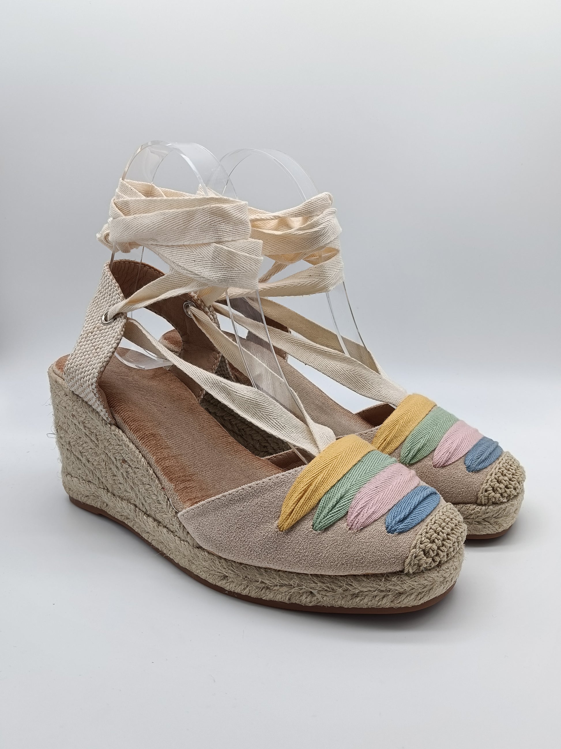 Eleva tu estilo con estas cuñas de yute, un clásico renovado que combina lo mejor de la tradición y la moda actual. Su diseño con puntera cerrada y detalle entrelazado en lona aporta un toque artesanal y sofisticado. La plataforma de esparto de 7cm ofrece altura y comodidad, ideal para acompañarte durante todo el día. Las cintas para anudar al tobillo no solo garantiza un ajuste perfecto, si no que suma un aire romántico y femenino que transforma cualquier look. Se recomienda pedir una talla más de la que usa normalmente.
