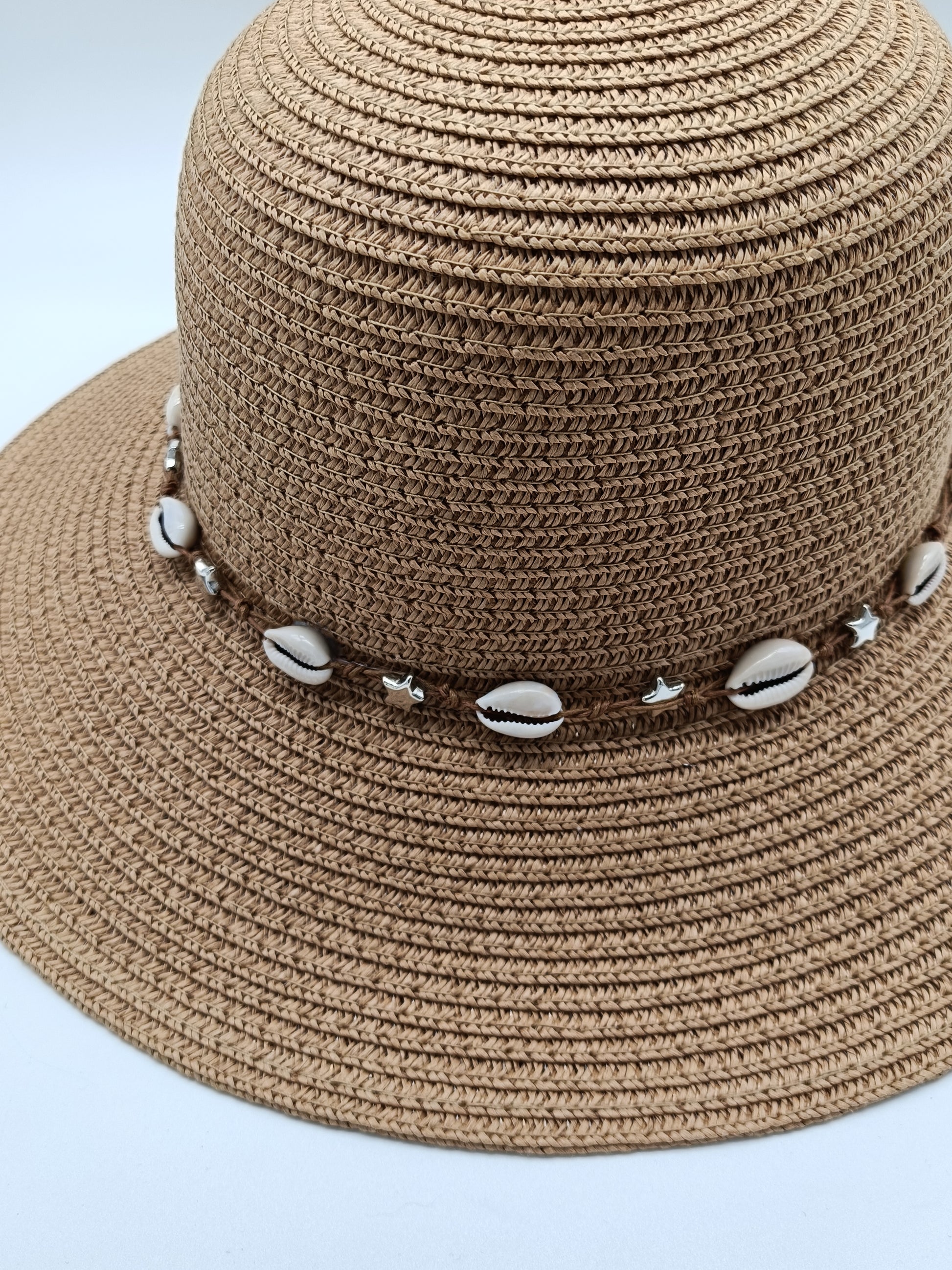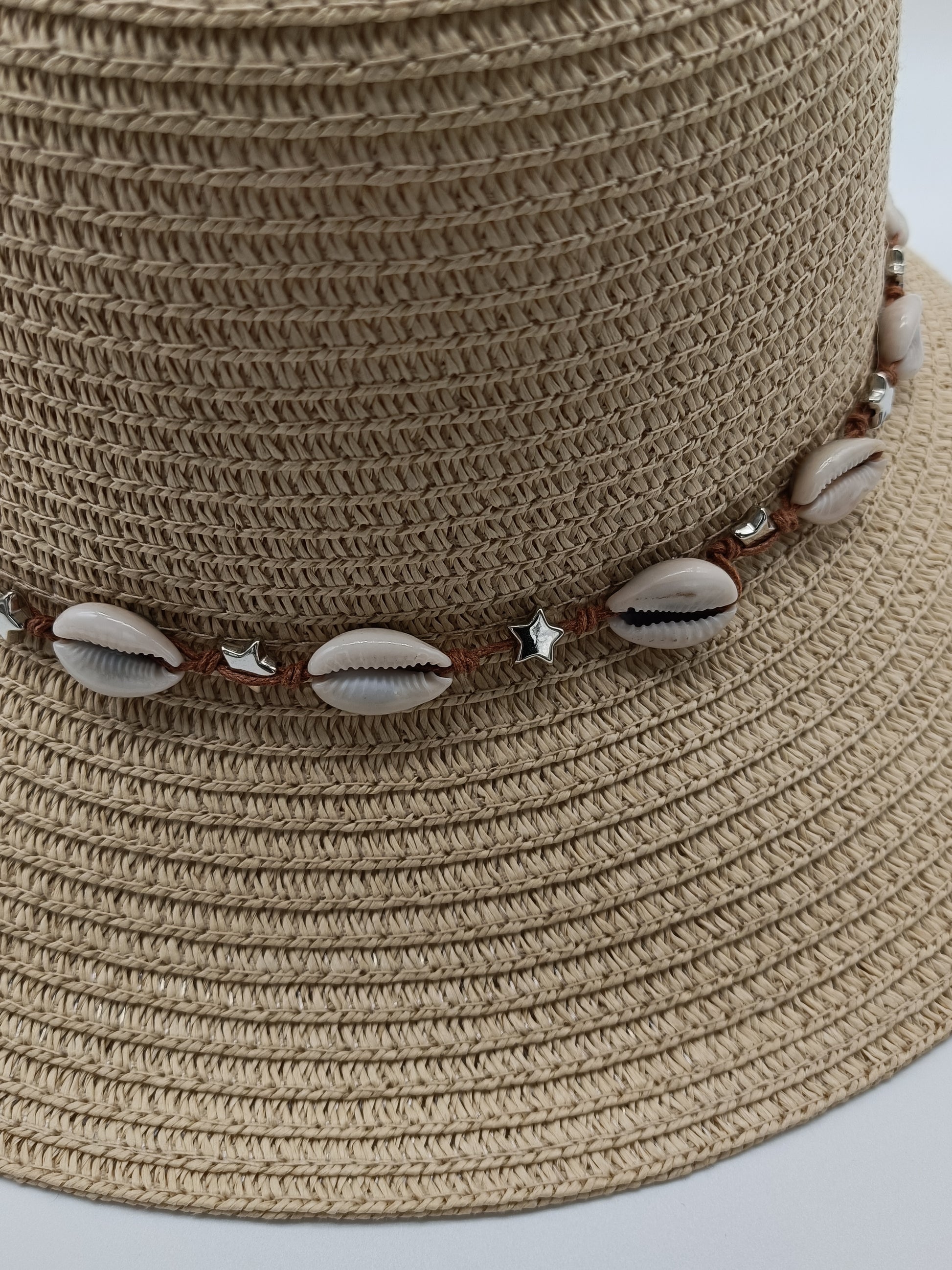 Sombrero tejido de ala media decorado con una delicada cinta de conchas y dijes marinos. Un accesorio con aire bohemio ideal para complementar tus looks playeros o de verano.
