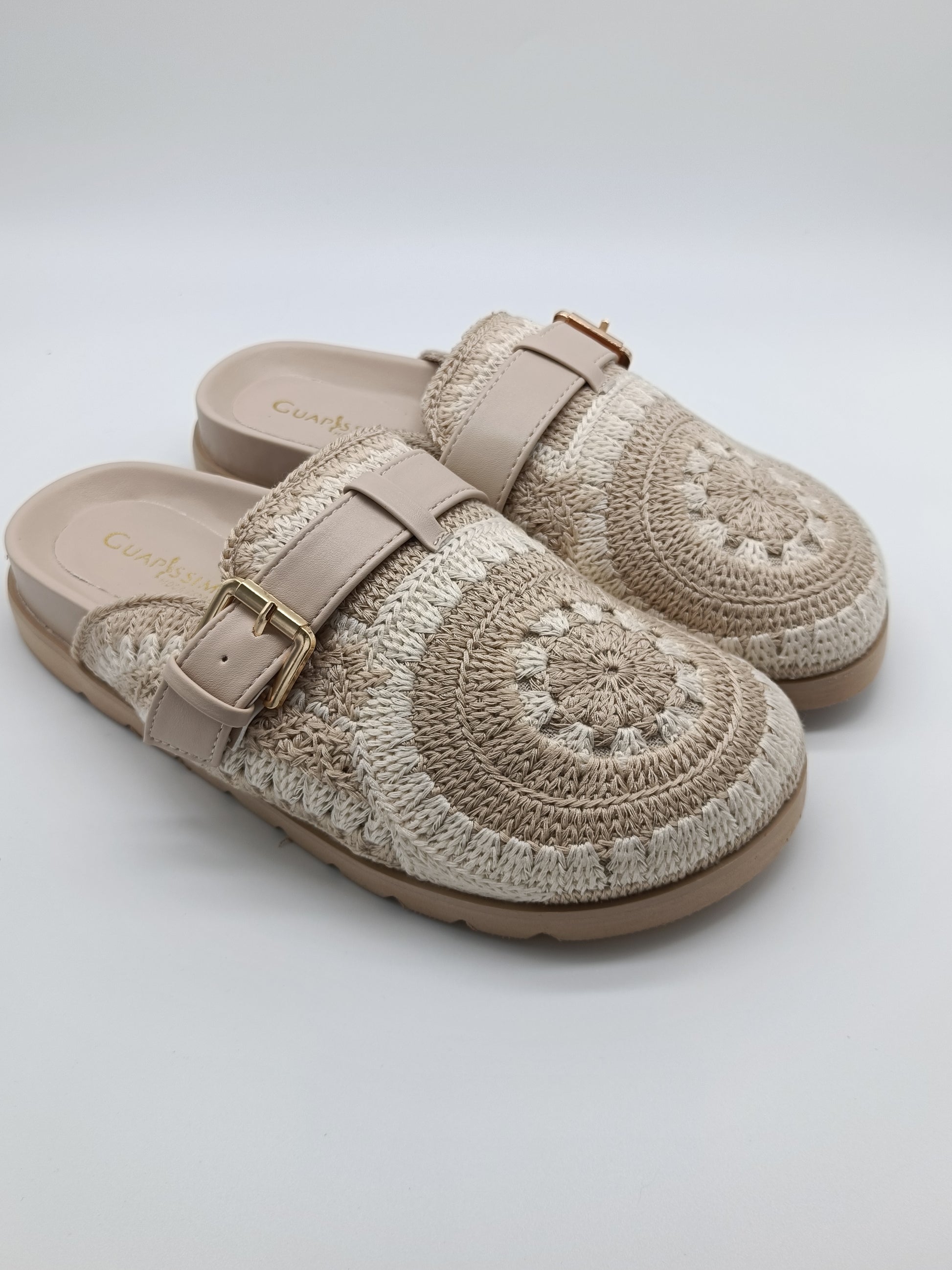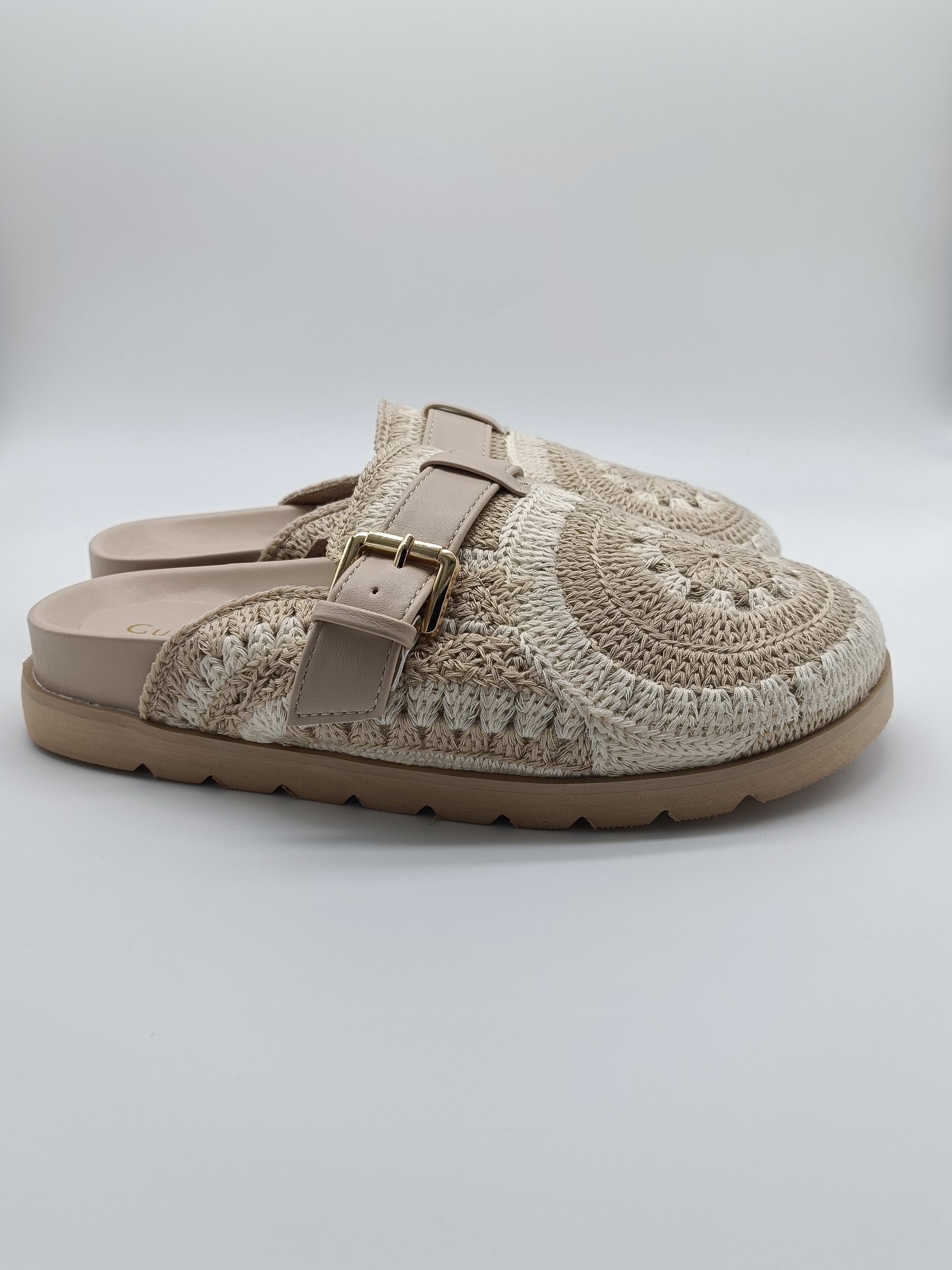 Destaca con estilo natural gracia a estos zuecos, ideales para la temporada de verano. Su diseño artesanal tipo crochet en tonos beige aporta un look relajado y único, mientras que la suela acolchada y la hebilla ajustable te ofrece confort y estabilidad durante todo el día.